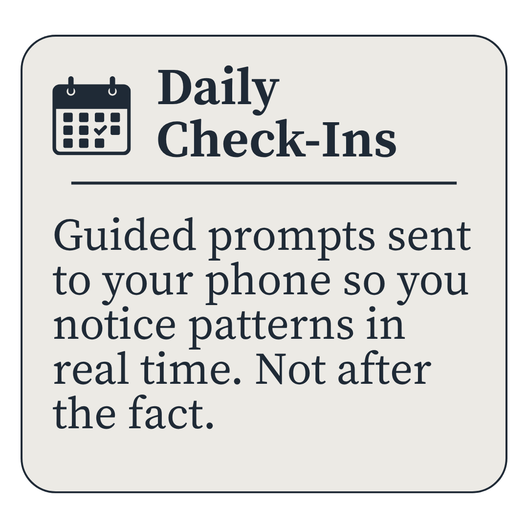 Every two weeks, your check-ins are reviewed and translated into clear patterns in how you think, feel, and respond. You don’t have to figure yourself out. Your patterns become visible. You’ll also receive targeted reflection questions to help you respond differently, not just understand more.