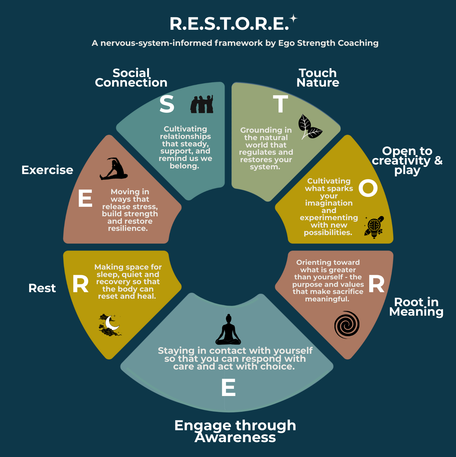 With that clarity, you can create simple Standard Operating Procedures (SOPs) — the supportive routines and structures that make life smoother. You reinforce all of this through RESTORE inputs like rest, movement, connection, and meaning, which keep your system grounded and resourced.