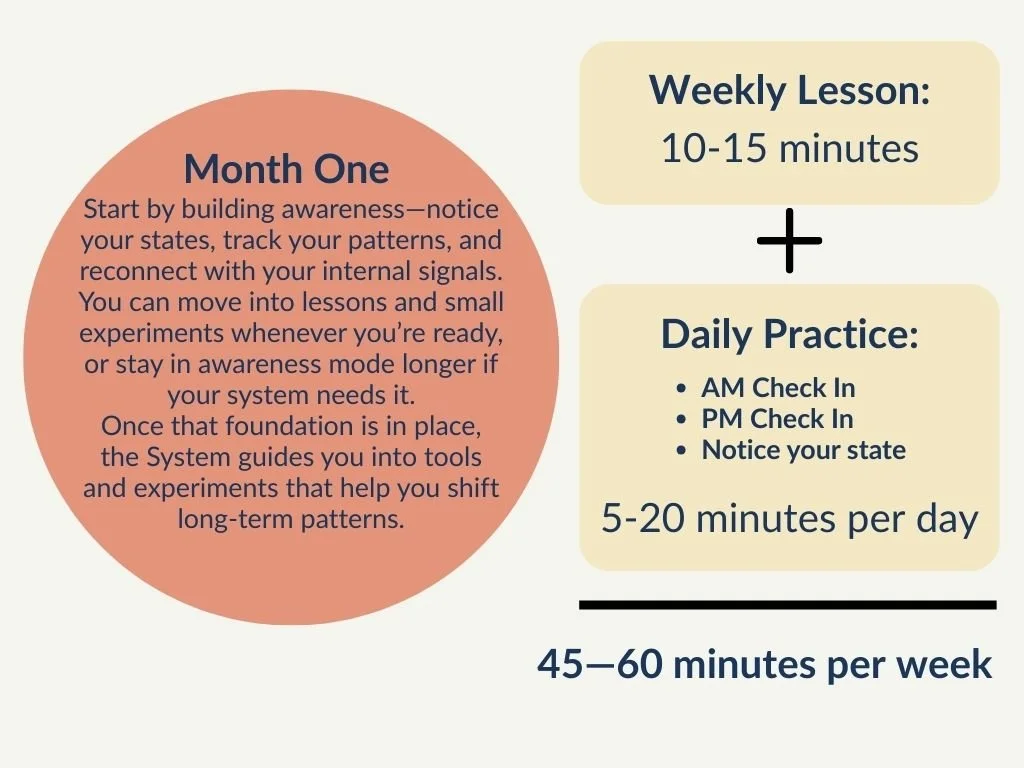 Part self-study, part nervous-system literacy, part pattern mapping, and part behavior design — all built into a daily, doable rhythm.